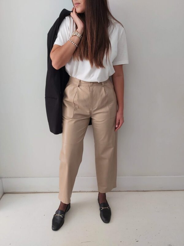 - High-waist leather pants in a wide line and a unique beige shade. Soft leather for better application in everyday life.