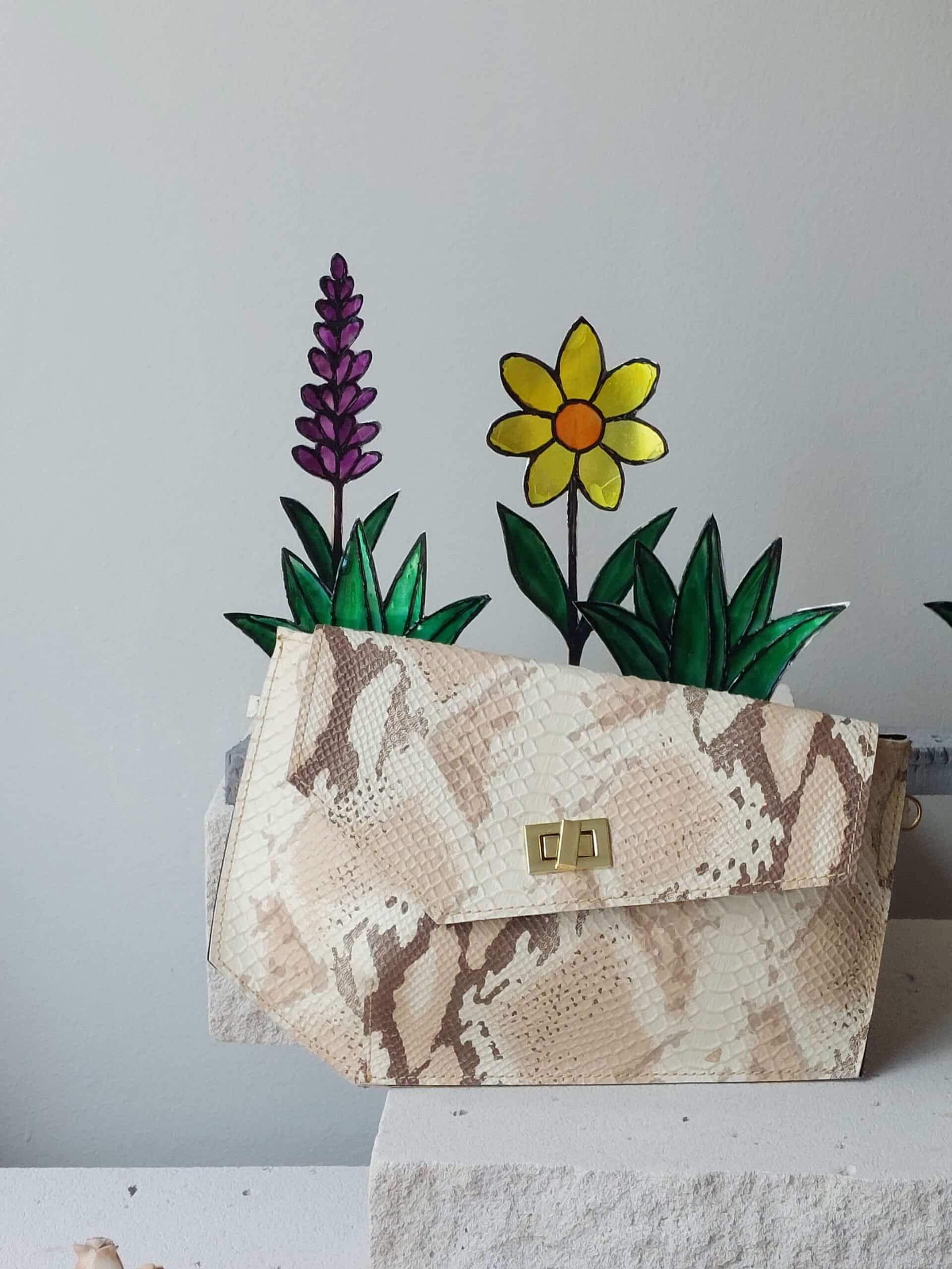 - Olivia δερμάτινο πολυμορφικό τσαντάκι με αποσπώμενο ιμάντα σε μπεζ φίδι δέρμα με χρυσά αξεσουάρ και γεωμετρικό σχήμα για μοναδικές εμφανίσεις.