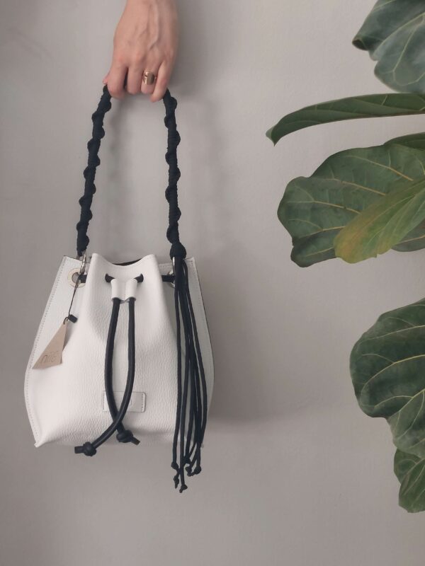 • Manu χειροποίητη δερμάτινη τσάντα ώμου από λευκό δέρμα με macrame χειροποίητο κοντό χεράκι και ρυθμιζόμενο ιμάντα για τον ώμο.